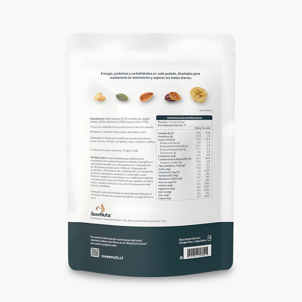 La versión con mayor aporte proteico de nuestra línea. Una potente mezcla de maní, almendras, semillas de zapallo, pasas y crujientes banana chips, diseñada para potenciar tu rendimiento físico y recuperación.
